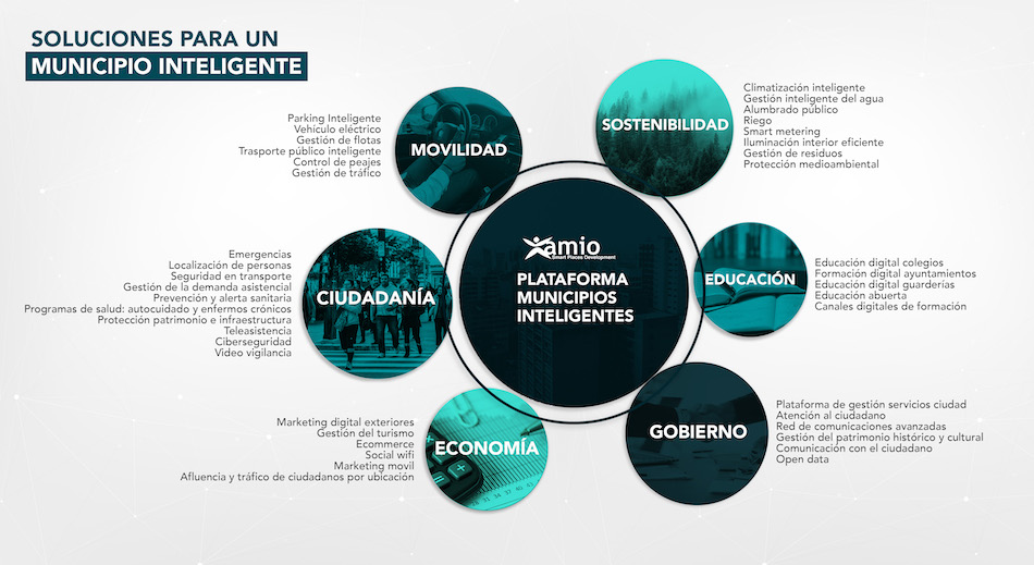 La implementación del modelo desarrollado de Municipio Inteligente se sustenta en torno a la implementación de una serie de iniciativas de base tecnológica, clasificadas y organizadas conforme a los 6 ejes estratégicos que forman el Modelo: